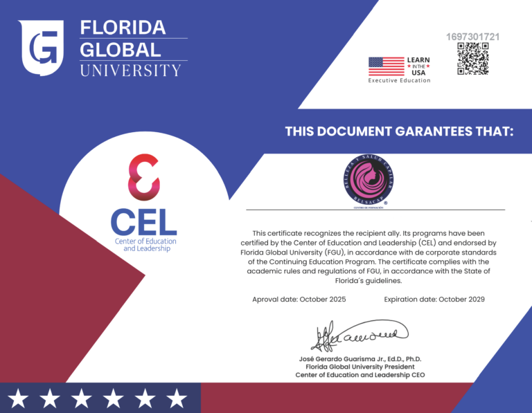 Al ser avalados por CEL (Center of Education and Leadership) y FGU (Florida Global University), nuestros alumnos obtienen una doble certificación de alto valor. Esta acreditación no solo eleva tu perfil, sino que te ofrece el camino directo para conseguir nuevas oportunidades en el extranjero y construir una carrera profesional sin límites.